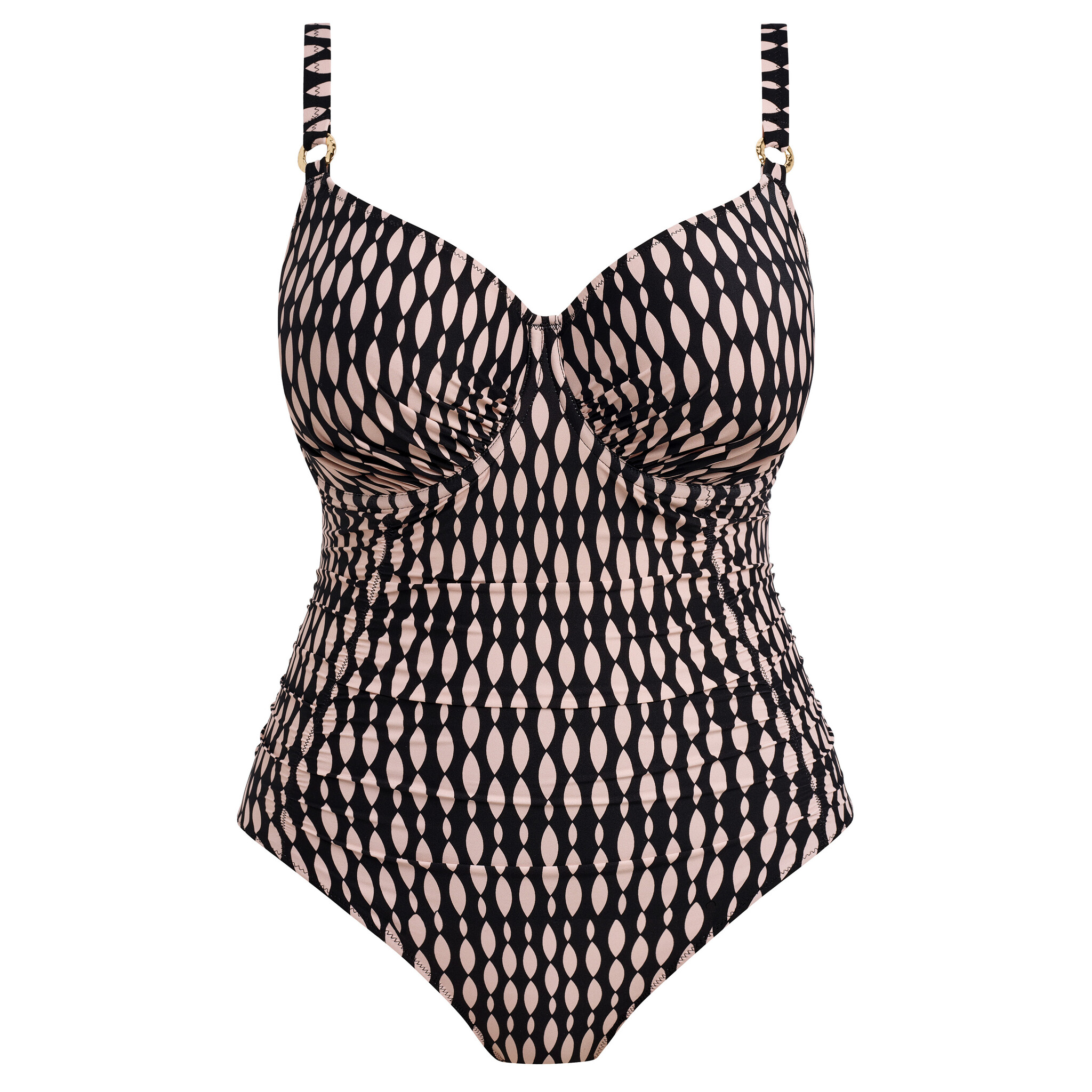 Ajoutez une touche de sophistication à votre garde-robe de vacances avec notre maillot 1 Pièce Bonnets entiers Shell Bay en Desert Blush, un imprimé graphique sophistiqué dans un ton rose pâle discret sur un fond noir contrastant. Ses bonnets emboîtants, dotés de renforts latéraux cachés, offrent un maintien optimal et une projection harmonieuse de la poitrine. Le panneau avant délicatement froncé est doublé d’un tissu légèrement gainant pour pour sculpter la silhouette tandis que les bonnets plissés assurent une coupe flatteuse.